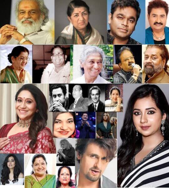 The period from about 1939-1959 is known as the Golden Era of film music, when melody was king. There were scores of songs – given that several hundred films were being released every week, with the mandatory minimum of eight songs per film, and in one case, 42 songs in a single film. The great singing stars of that period included K.L. Saigal, Khursheed, Suraiya and Noorjehan followed by Kishore Kumar, Lata Mangeshkar, Asha Bhosle, Mohammed Rafi, Mukesh, S. P. Balasubrahmanyam, K. J. Yesudas, S. Janaki, P. Susheela, K. S. Chithra, MG Sreekumar, Udit Narayan, Amit Kumar, Alka Yagnik, Sujatha,Hemlata, Kumar Sanu, Armaan Malik, Sonu Nigam, Shaan, KK, Shreya Ghoshal, Arijit Singh, Mohit Chauhan, Javed Ali, Neha Kakkar,……etc.